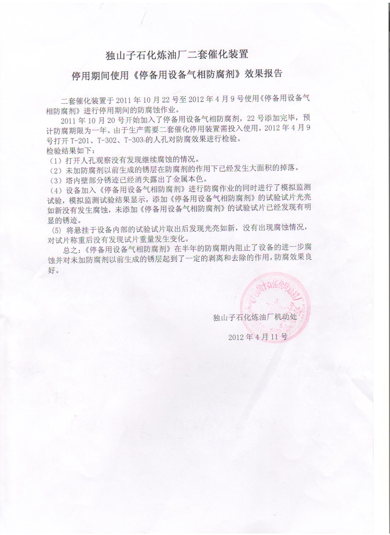 停備用設(shè)備氣相防腐劑獨(dú)山子石化使用效果報(bào)告正式文件